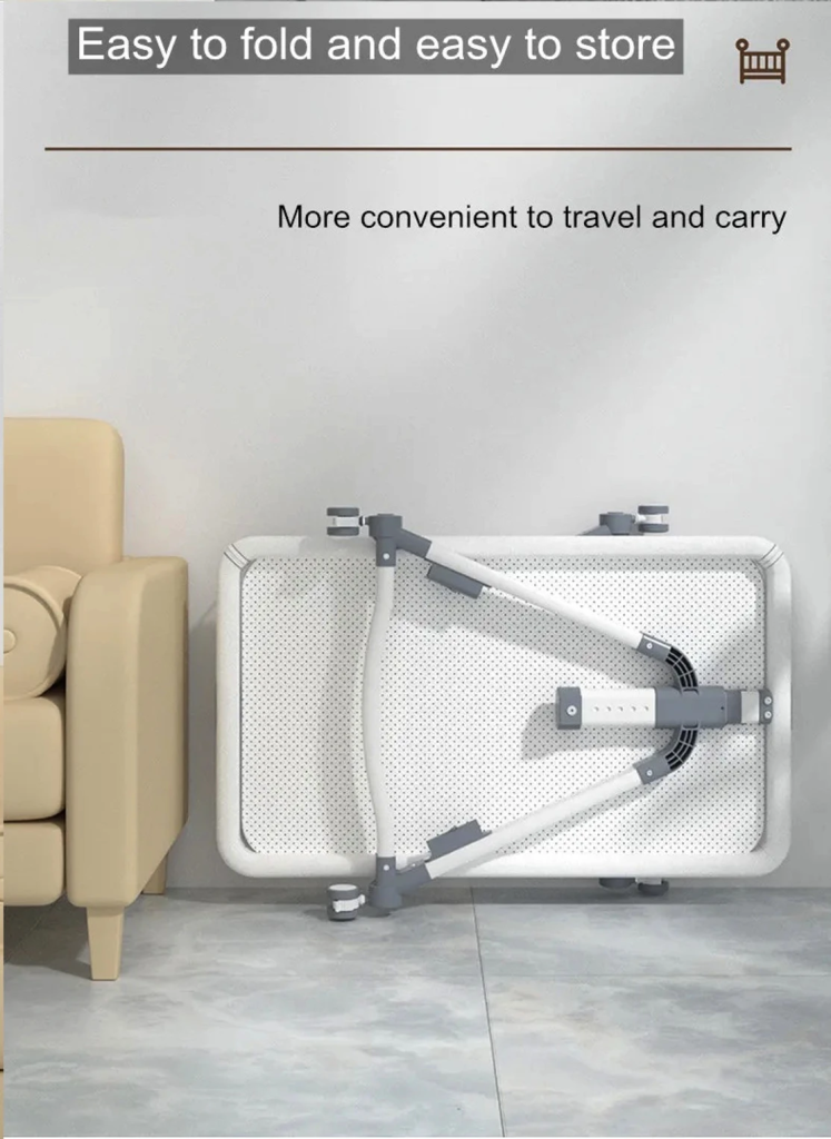 The Babyteddy Portable Baby Crib Cot Cradle Bassinet Bedside Swing Bed is built with a sturdy yet lightweight metal frame for stability and portability. The breathable fabric sides promote airflow, while the soft mattress ensures comfort. The attached mosquito net provides extra protection, making this baby bassinet with mosquito net suitable for Indian households.