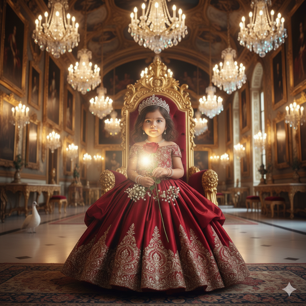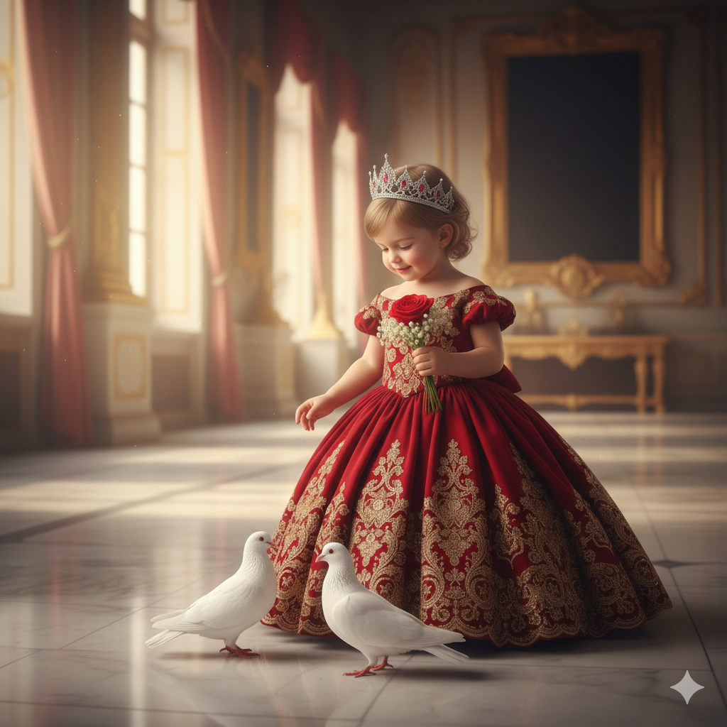Enchanted Child ,In a world often captivated by the rush of modern life, there remains an enduring fascination with timeless elegance and the innocent grandeur of childhood. Our minds are drawn to a magnificent tableau: a luxurious royal hall, a space designed to evoke awe and wonder. Towering ceilings soar above, reflecting the gleam of polished marble floors. The walls are adorned with countless golden ornate frames, each one a portal to history, while grand chandeliers, sparkling like frozen cascades of diamonds, cast their radiant glow throughout the immense space.