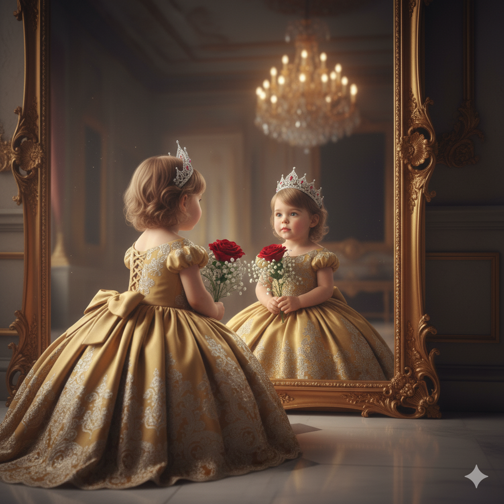 The same 3-year-old baby girl, in her deep red ball gown and crown, standing slightly turned, catching her gaze in an antique, full-length mirror within the royal hall. This time, the reflection subtly shows her wearing a different color gown (e.g., gold or white), hinting at different possibilities or dreams. She holds her flowers. The lighting is artistic, playing with reflections and illusions. High-quality artistic portrait, cinematic, detailed, imaginative, reflective princess aesthetic.
