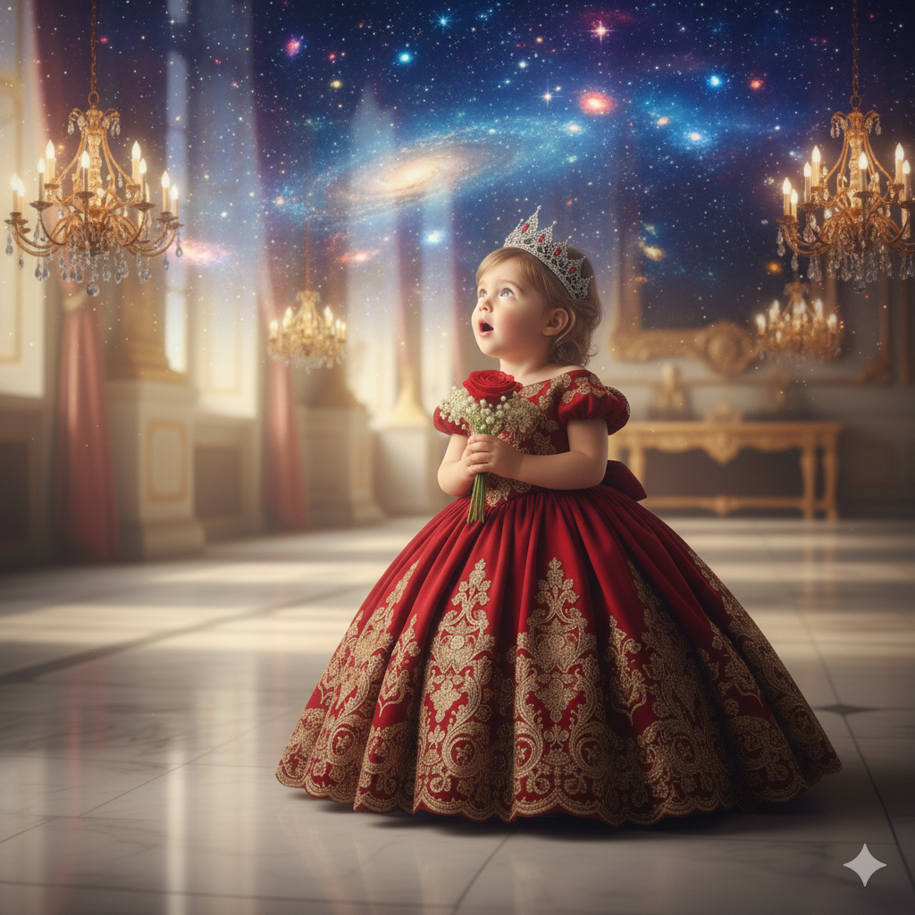 The same 3-year-old baby girl, in her deep red ball gown and crown, standing in the royal hall, but the ceiling and upper walls are magically projected with a swirling, beautiful starry night sky. The chandeliers are still present but subtly integrated. She looks up with awe, holding her flowers. The atmosphere is cosmic and dreamlike, with mystical blue and purple hues blending with the golden hall lights. High-quality celestial photography, cinematic, detailed, ethereal, cosmic princess aesthetic.