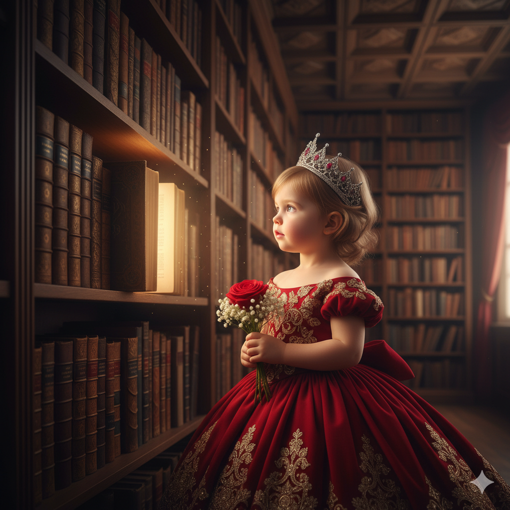 The same 3-year-old baby girl, in her deep red ball gown and crown, standing in front of a towering, antique bookshelf within the royal hall. One of the books on the shelf appears to be slightly ajar and glowing faintly, as if a story is about to unfold. She is looking towards the book with an expression of curious wonder, holding her flowers. The lighting is soft and intriguing, high-quality whimsical photography, cinematic, detailed, curious, enchanted library princess aesthetic.
