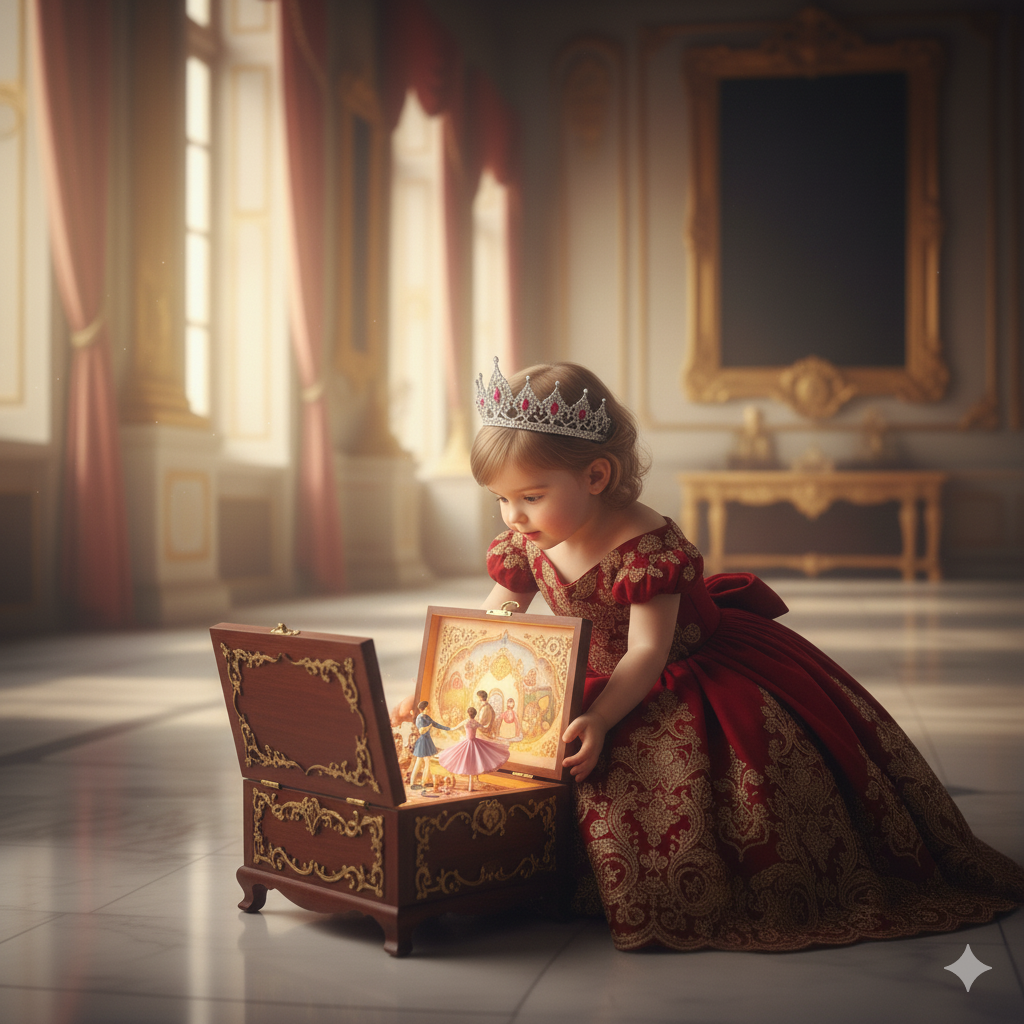 The same 3-year-old baby girl, in her deep red ball gown and crown, sitting gently on the floor in the royal hall, fascinated by an intricately crafted, open musical box that plays a delicate tune. Small, dancing figures might be visible inside. She holds her flowers, leaning in with a look of pure wonder. The lighting is intimate and soft, highlighting the magical glow of the musical box. High-quality intimate photography, cinematic, detailed, enchanting, musical wonder princess aesthetic.