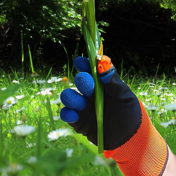 Being lightweight and ergonomically built means you can use this thumb knife comfortably whether you’re picking fruits, trimming herbs, or removing unwanted stems. Its compact size makes it easy to carry around the garden, and the silicone grip is easier to clean and maintain compared to full-glove solutions.