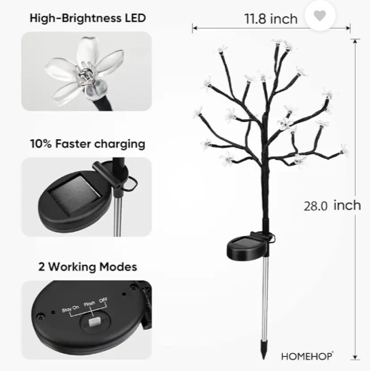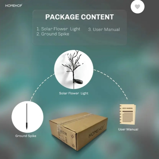 Unboxing the HomeHop solar garden lights is simple. Inside the box, you will find the LED flower lamps, solar panel stake, and ground spikes. First, assemble the stake and firmly insert it into soft soil where sunlight is available. Ensure the solar panel faces direct sunlight for efficient charging. Switch the power button ON (usually located behind the panel). The HomeHop solar garden lights outdoor automatic system will charge during the day and turn on automatically at night. For maintenance, clean the solar panel occasionally using a soft cloth to remove dust or dirt.