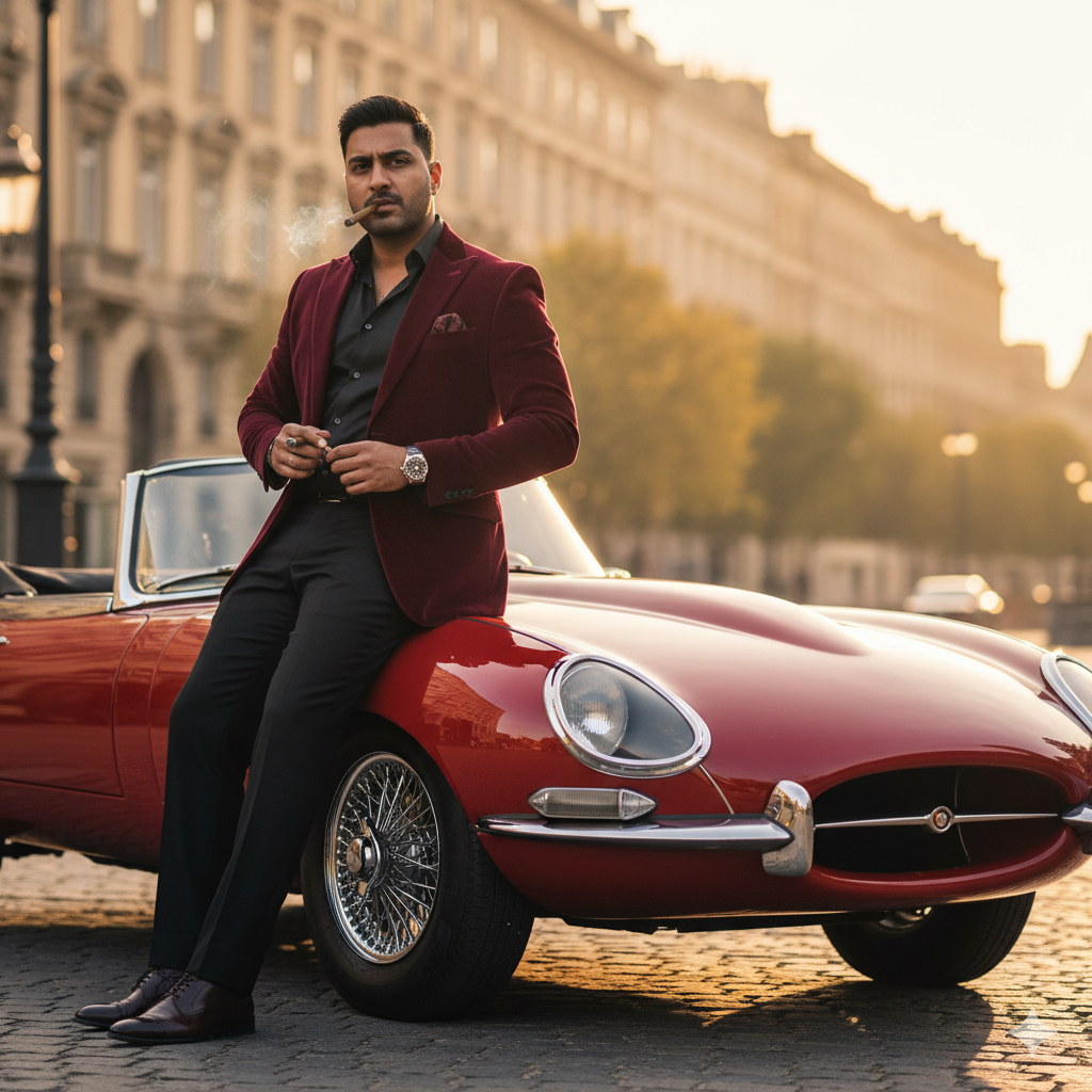 Ultra-realistic outdoor photo of an Indian man taking a subtle puff from a cigar, in a rich burgundy velvet blazer, black trousers, and a black silk polo shirt, along with dark brown patent leather shoes, leaning against the hood of a classic deep red Jaguar E-Type convertible with shining chrome wire wheels, reflecting the golden hour.
