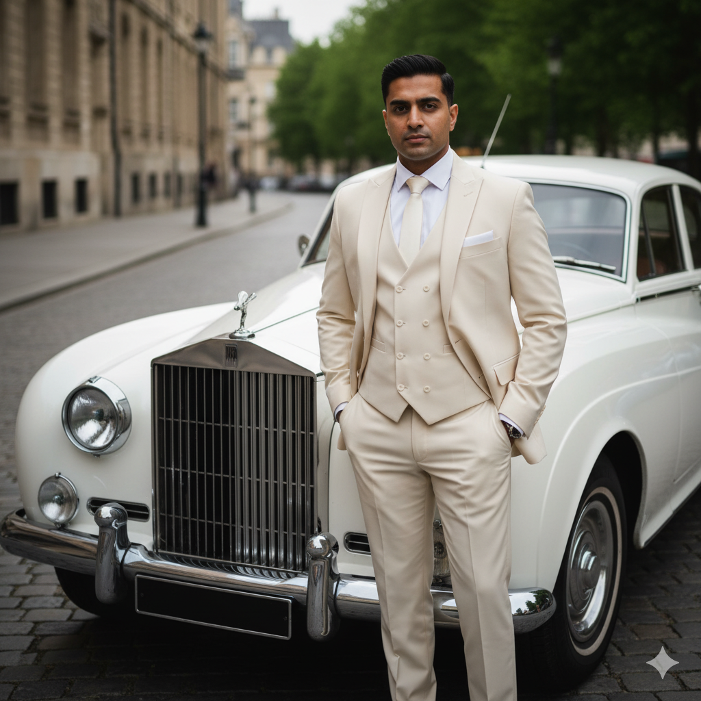 Ultra-realistic outdoor photo of an Indian man with hands in his suit pockets, a calm but commanding demeanor, wearing a cream three-piece suit, a crisp white shirt, and a matching cream tie, standing in front of a pristine white Rolls-Royce Silver Cloud II with its iconic grille, illuminated by soft, diffused daylight.