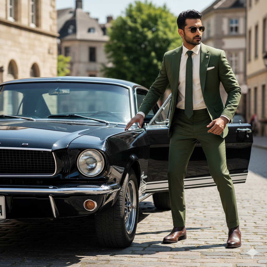 Ultra-realistic outdoor photo of an Indian man opening the driver’s side door, clad in a sharp olive green suit, a light cream shirt, and a patterned dark green tie, with dark brown leather boots, about to enter a vintage black Ford Mustang Fastback (1967 model) with racing stripes, under a clear midday sun.