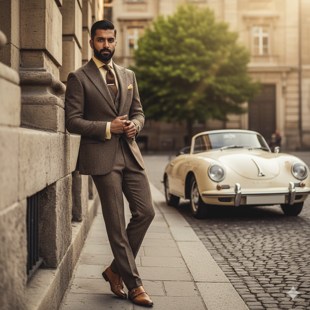 Ultra-realistic outdoor photo of an Indian man leaning against an ornate stone wall, an air of quiet authority, wearing a custom-tailored brown herringbone suit, a pale yellow shirt, and a subtly striped brown tie, with tan leather monk strap shoes, a classic crème-colored Porsche 356 Speedster with chrome bumpers parked nearby, bathed in the soft light of late afternoon.