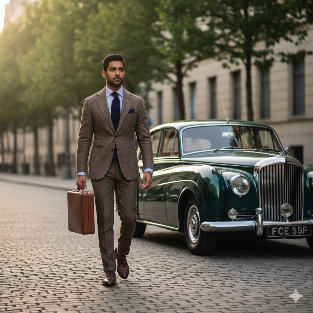 Ultra-realistic outdoor photo of an Indian man walking with a vintage leather briefcase in hand, a purposeful stride, wearing a bespoke tweed suit, a light blue chambray shirt, and a knitted dark blue tie, along with polished brown spectator shoes, passing by a classic dark green Bentley S1 Continental with a long elegant body, on a tree-lined street in gentle morning light.