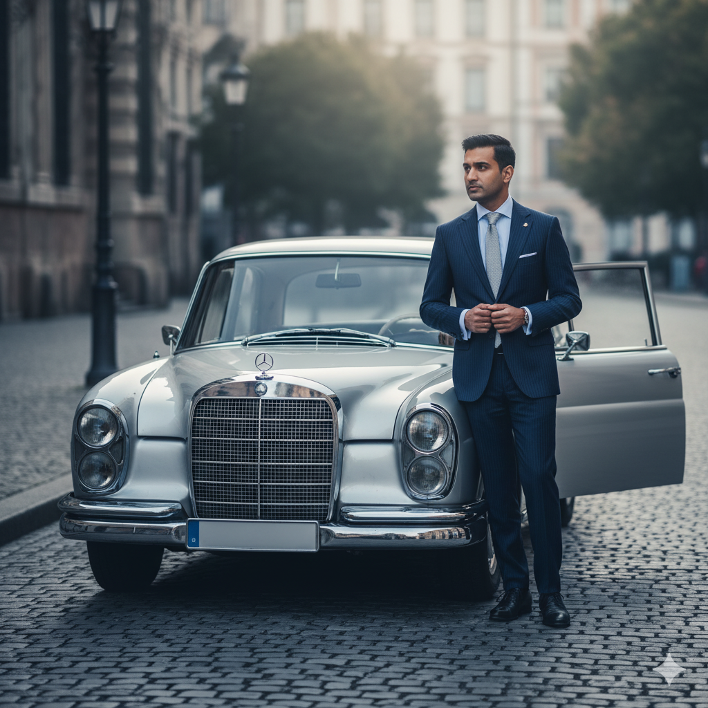 Ultra-realistic outdoor photo of an Indian man with a thoughtful expression, dressed in a tailored navy blue pinstripe suit, a light blue shirt, and a silver tie, standing beside an open door of a vintage silver Mercedes-Benz S-Class (W111 Fintail) with polished chrome, bathed in soft, early morning light.